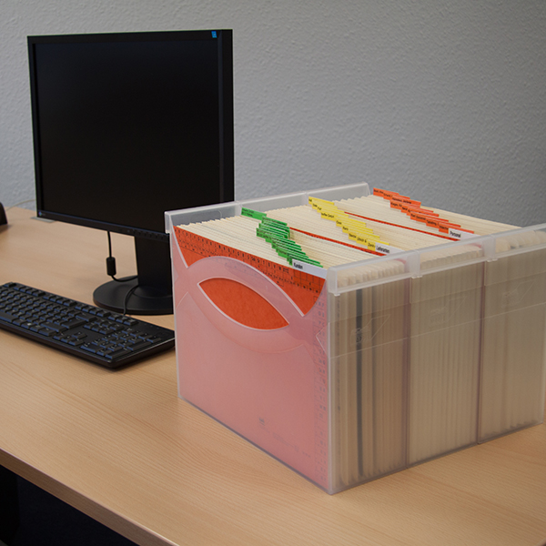 Dokumente und Vorgänge, die Sie direkt im Blick haben möchten, legen Sie einfach in Ordnungsmappen ab und platzieren diese dann in Ordnungsboxen auf dem Schreibtisch. Besonders gut eignen sich hierfür auch unsere Ordnungsboxen aus Acrylglas. Soll der Schreibtisch zum Feierabend leer sein? Oder müssen die Dokumente verschlossen aufbewahrt werden? Sie können die Ordnungsboxen einfach und schnell vom Schreibtisch nehmen und sicher verstauen.