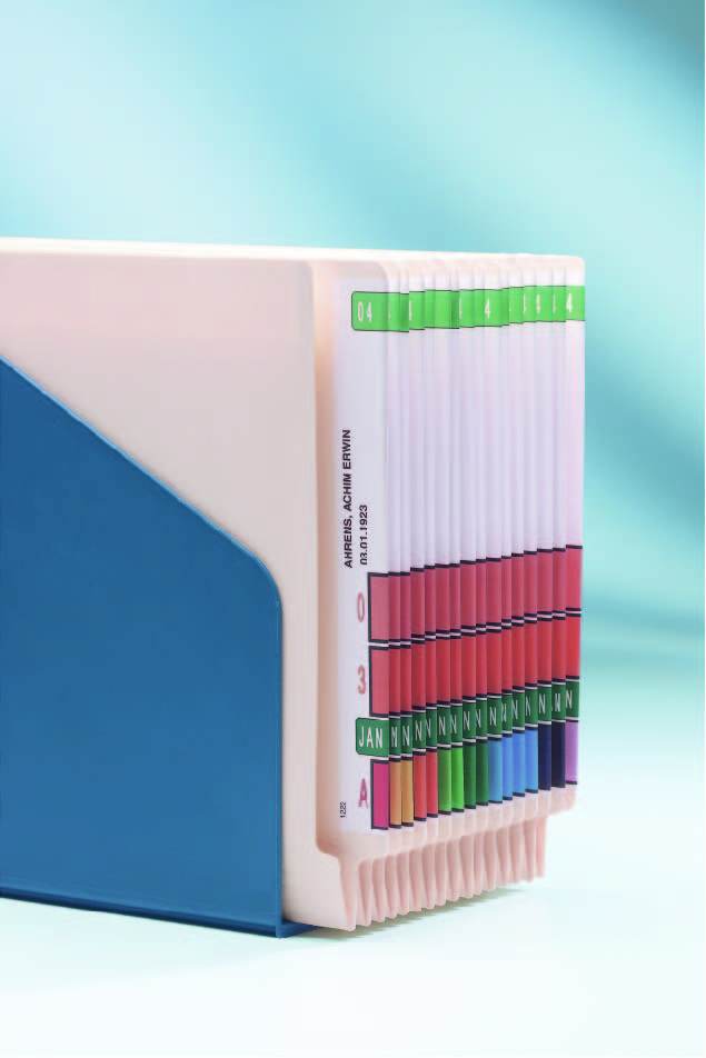 Das TABCOLOR-System sichert jederzeit einen leichten Zugriff auf benötigte Informationen. Das farbgestützte Ordnungsprinzip lässt sich visuell leicht erfassen und schafft bestmögliche Übersicht. Dadurch bleiben die Suchzeiten sehr gering. Alle TABCOLOR-Etiketten bestehen aus Ziffern und/oder Buchstaben mit fest zugeordneten Farbfeldern. Organisiert man seine Akten z. B. nach den ersten drei Buchstaben eines Namens, so entstehen zusammenhängende Farbblöcke. Einzelne Vorgänge lassen sich anhand farbiger Kriterien viel leichter erkennen. Finden statt Suchen – TABCOLOR macht es möglich.