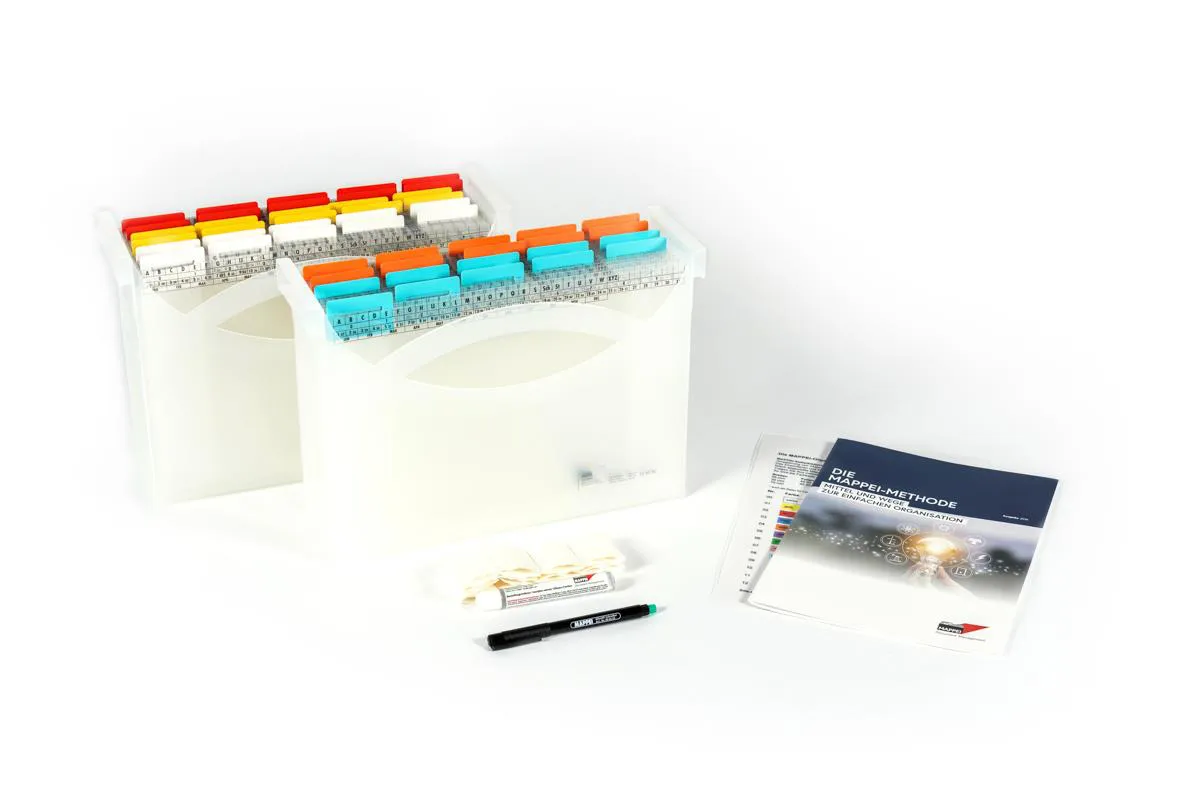 Das HomeOffice Set "Fit" ist die optimale Lösung für eine schnelle Übersicht Ihrer Projekte und temporären Dokumente im Homeoffice. Mit dieser Ausstattung behalten Sie alles im Blick und im Griff, sodass Sie effizient arbeiten können.Mit dem HomeOffice Set "Fit" erhalten Sie eine umfangreiche Ausstattung wiederverwendbarer Aktionsmappen, die Ihnen eine schnelle und flexible Organisation Ihrer Unterlagen ermöglicht. Die Mappen sind robust und wiederverwendbar, sodass Sie den Begriff nach Erledigung des Vorgangs einfach löschen und die Mappe für neue Aufgaben verwenden können. Die klaren Aktionsmappen mit verschiedenen Farben für die Beschriftungsläufer ermöglichen es Ihnen, Ihre Dokumente gezielt zu kennzeichnen und nach Bedarf zu sortieren. So behalten Sie stets die Übersicht über Ihre Projekte und können schnell auf benötigte Unterlagen zugreifen.Die Standard-Ordnungsboxen bieten eine platzsparende und übersichtliche Aufbewahrungsmöglichkeit für Ihre Mappen und passen in alle genormten Hängeregistratur-Möbel. Dadurch haben Sie Ihre Unterlagen stets griffbereit und können effizient arbeiten, ohne lange suchen zu müssen. Zusätzlich erhalten Sie einen Allstoffschreiber, ein Löschset zur Reinigung der Beschriftungsläufer sowie eine Farbkarte für Ihren individuellen Aktenplan. Alles, was Sie brauchen, um Ihr Homeoffice optimal zu organisieren und erfolgreich zu arbeiten.Bestellen Sie jetzt das HomeOffice Set "Fit" und machen Sie Ihr Homeoffice fit für eine effiziente und gut organisierte Arbeit!Ab sofort beinhaltet das Set auch das Buch zur MAPPEI-Methode (Art.-Nr. M1001) - "Ordnung ohne Stress" im Wert von ca. 30 Euro (inkl. Mwst.)!Set bestehend aus: - 2 Ordnungsboxen 30 44 88 (348 x 244 x 105 mm (B x H x T); Standfläche: 326 x 105 mm) - 10 Aktionsmappen klar, mit Läufer weiß 12 40 90/00, wiederverwendbar - 10 Aktionsmappen klar, mit Läufer gelb 12 40 90/01, wiederverwendbar - 10 Aktionsmappen klar, mit Läufer rot 12 40 90/02, wiederverwendbar - 10 Aktionsmappen klar, mit Läufer blau 12 40 90/03, wiederverwendbar - 10 Aktionsmappen klar, mit Läufer orange 12 40 90/04, wiederverwendbar - 1 Allstoffschreiber 90 00 20 - 1 Löschset 90 00 33 zur Reinigung der Beschriftungsläufer - 1 Farbkarte für Ihren individuellen Aktenplan 90 00 06 - Anleitung